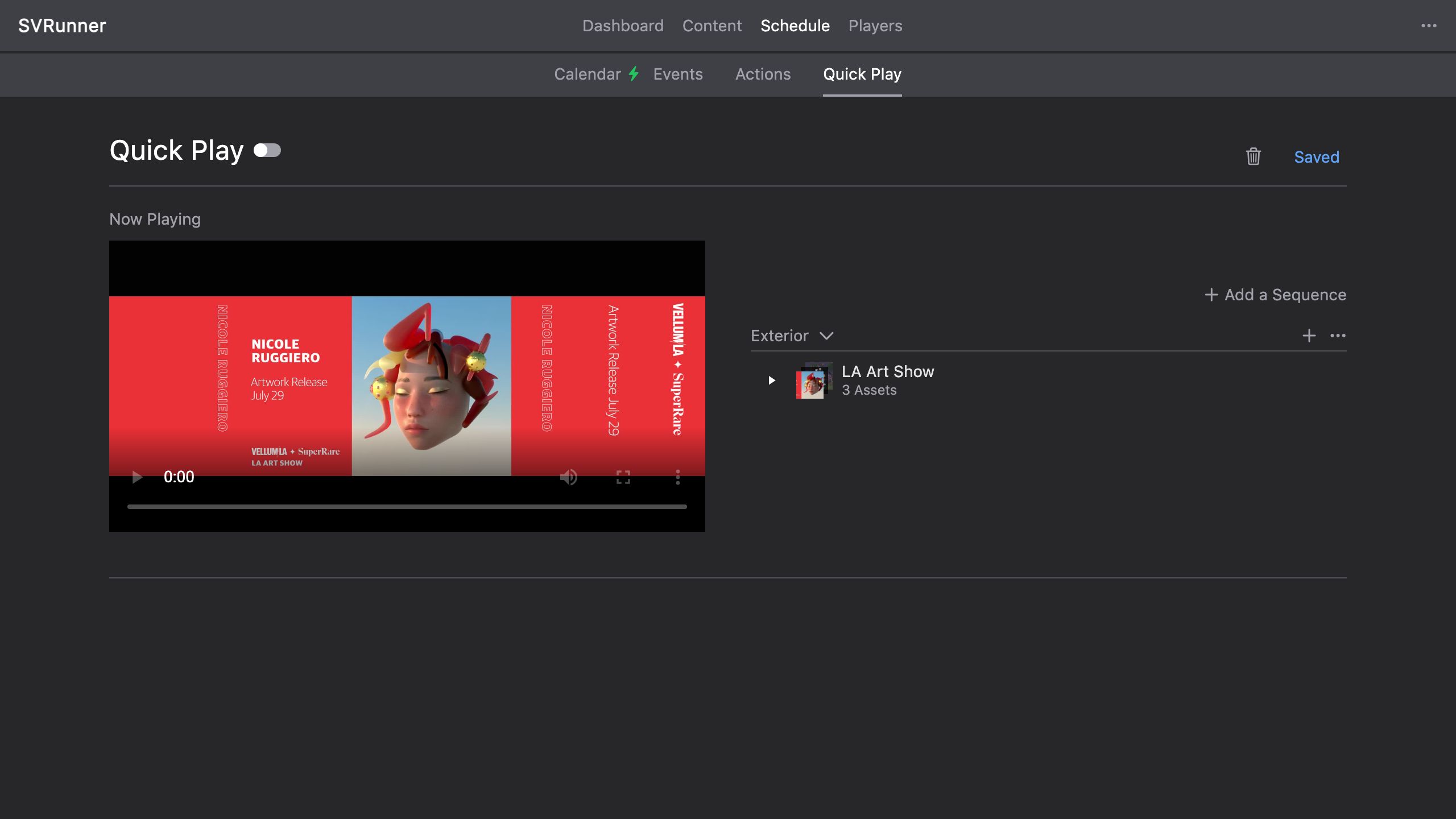 Quick Play is a way to immediately play one or more assets. This will override SVR scheduled playlists and will instead play assets from the Quick Play sequence.